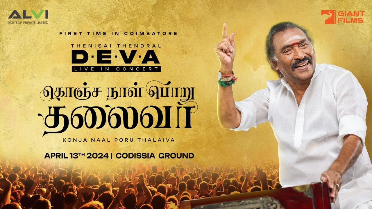 கோயம்புத்துரில் வரும் ஏப்ரல் 13 ஆம் தேதி, மக்களின் மனம் கவர்ந்த நமது தேனிசை தென்றல் தேவாவின் இசைக்கச்சேரி நடைபெறவுள்ளது. ALVI Digitech மற்றும் Giant Films நிறுவனங்கள் இணைந்து, மிகப்பிரம்மாண்டாமான முறையில், கோயம்புத்தூரின் கொடிசியா மைதானத்தில், இந்நிகழ்ச்சியை நடத்தவுள்ளது.