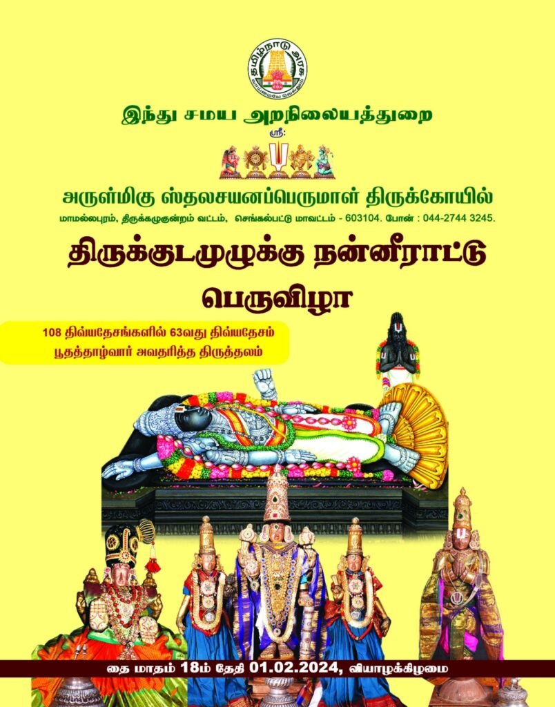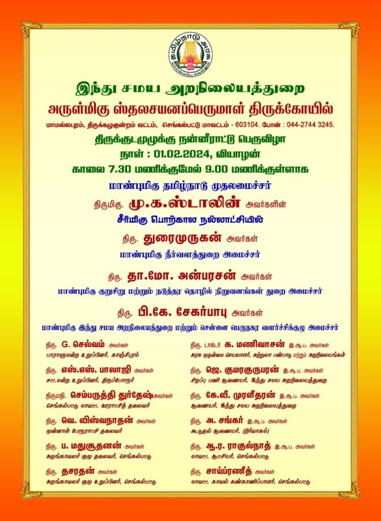 வருகிற பிப்ரவரி ஒன்றாம் தேதி வியாழக்கிழமை, தை மாதம் 18ம் தேதி, காலை 7.30 மணி முதல் 9 மணிக்குள் இந்தத் திருக்குடமுழுக்கு நன்னீராட்டுப் பெருவிழா நடைபெறுகிறது.