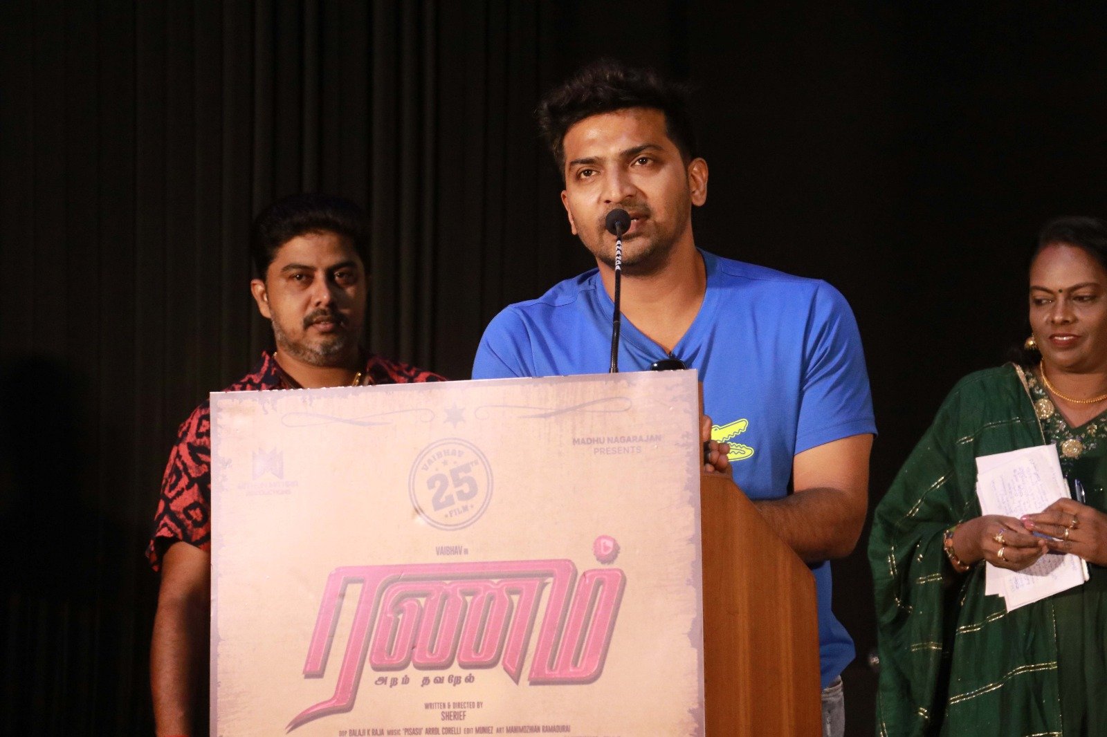 அந்த அறம் தர்மம் என்பது தானம் மட்டுமல்ல; உண்மைக்காக குரல் கொடுப்பது; அநியாயத்தை எதிர்ப்பது. இது எல்லாமே தர்மம் மற்றும் அறம் தான். அதை நாம் யோசிக்காமல் செய்ய வேண்டுமென்பதை வலியுறுத்தியே இப்படம் எடுக்கப்பட்டுள்ளது. வீடியோ காலில் தான் கதை சொன்னேன். ஒரு வாரத்தில் ஓகே செய்து அக்ரிமெண்ட் சைன் செய்தேன். இதற்காக தயாரிப்பாளர் மது சார் அவர்களுக்கு நன்றி., வைபவ் சார் கதை கேட்டவுடன் ஒரு இயக்குநர் பேரைச் சொல்லி இது போலவா..? என்று கேட்டார். நானும் ஆர்வக் கோளாறில் ஆமாம் என்று சொல்லிவிட்டேன். அவர் தற்போது படம் பார்த்துவிட்டார். அவருக்குப் பிடித்திருக்கிறது என்று நினைக்கிறேன். அவருக்கு நன்றி. கலை இயக்குநர் விழா படத்தில் இருந்தே எனக்கு நல்லப் பழக்கம். அவருக்கும் நன்றி. எனக்கு உறுதுணையாக இருந்த செல்வம், பாலாஜி, உதய் ஆகியோருக்கு நன்றி. இசையமைப்பாளர் அரோல் கரோலி அவர்களுக்கு நன்றி., அவரின் பின்ணனி இசை பேசப்படும். பிற நடிகர் நடிகைகள் அனைவருக்கும் நன்றி. எங்கள் படம் பற்றி பாசிட்டிவ் ஆக பேசிக் கொண்டிருக்கும் சுரேஷ் சக்ரவர்த்தி சார் அவர்களுக்கு நன்றி.