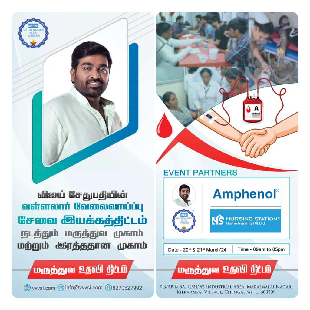விஜய்சேதுபதியின் மருத்துவ உதவி திட்டத்தின் கீழ் விஜய்சேதுபதியின் வள்ளலார் வேலை வாய்ப்பு சேவை இயக்கம், NURSING STATION HOME NURSING PRIVATE LIMITED மற்றும் AMPHENOL OMNICONNECT INDIA PVT LTD இணைந்து 20-மார்ச் மற்றும் 21- மார்ச் ஆகிய இரண்டு நாட்கள் மருத்துவ முகாம் மற்றும் இரத்ததான முகாம் செங்கல்பட்டு மாவட்டம், மறைமலை நகர்பகுதியில் நடைபெற்றது.
