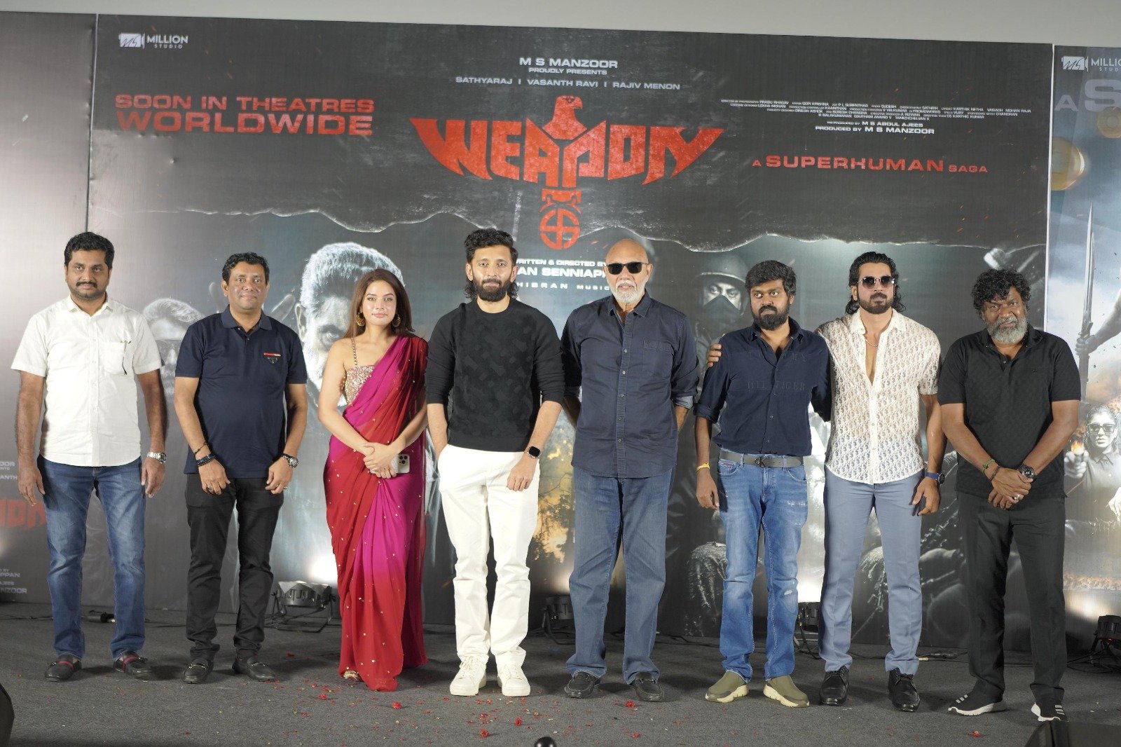 நடிகர் வசந்த் ரவி, “தமிழில் சூப்பர் ஹூ்யூமன் கதைகளை எடுத்து செய்வது என்பது சாதாரண விஷயம் கிடையாது. அதை இயக்குநர் குகன் விரும்பி செய்திருக்கிறார். சின்ன வயதில் இருந்தே நிறைய காமிக்ஸ் கதைகளை அவர் படித்து வளர்ந்ததால் சினிமாவில் அதை செய்ய வேண்டும் என்று ஆசைப்பட்டு அதற்கான முதல்படியாக ‘வெப்பன்’ படத்தை எடுத்திருக்கிறார். இந்த மாதிரியான படங்களுக்கு பெரிய பட்ஜெட் தேவைப்படும். அதை செய்து கொடுத்த மில்லியன் ஸ்டுடியோவுக்கு நன்றி. படத்தின் டிரெய்லரை நெல்சன் சாரிடம் இரண்டு நாட்களுக்கு முன்பு காட்டினேன். ‘டிரெய்லர் ரொம்ப நல்லாருக்கு. இதுபோன்ற ஃபேண்டஸி ஆக்ஷன் படம் வந்து ரொம்ப நாள் ஆச்சு என்றார். ’ராக்கி’ படத்தில் பாரதிராஜா சாருடன் நடித்தேன். பின்பு, ‘ஜெயிலர்’ படத்தில் ரஜினி சாருடன். அவர்களிடம் நிறைய விஷயங்கள் கற்றுக் கொண்டேனோ அதேபோலதான், சத்யராஜ் சாரிடமும் நிறையக் கற்றுக் கொண்டேன். மனதில் இருக்கும் எதையும் வெளிப்படையாக சொல்லி விடுவார். அவர் எவ்வளவோ படங்கள் நடித்தி்ருந்தாலும் இந்த படம் அவரது கரியரில் மறக்க முடியாததாக இருக்கும். அவருடன் இணைந்து பணிபுரிந்தது மகிழ்ச்சி. தான்யா இதுவரை நடித்த படங்களிலேயே தனக்குப் பிடித்த படமாக ‘வெப்பன்’தான் சொன்னார். நான் எவ்வளவோ ஜானர்களில் படங்கள் செய்து இருந்தாலும் சூப்பர் ஹூயூமன் என்பது புது ஜானர். ஹாலிவுட் படங்களைப் போல இந்தப் படத்தைப் பாருங்கள். இது ப்ரீகுவல்தான். குகன் இந்த கதைக்கு ஒரு யுனிவர்ஸே வைத்துள்ளார். படம் பார்த்துவிட்டு சொல்லுங்கள்” என்றார்.