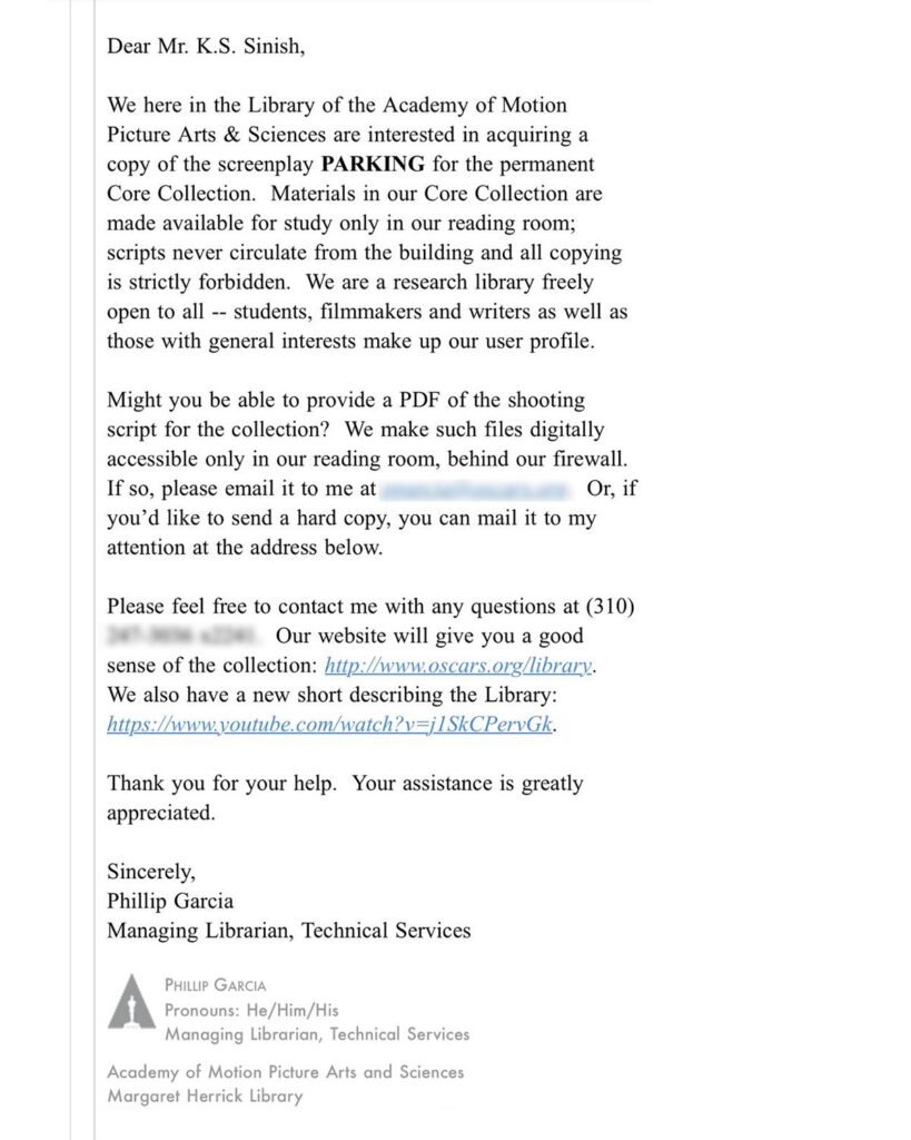 செழுமையான உள்ளடக்கம் கொண்ட நல்ல கதைகள் எல்லைகளைக் கடந்து உலக அங்கீகாரத்தைப் பெறும். தமிழ் சினிமாவில் வெளியான பல படங்கள் அதன் நல்ல திரைக்கதை மூலம் இதை நிரூபித்துள்ளது. இதற்கு சமீபத்திய சிறந்த உதாரணம் நடிகர் ஹரிஷ் கல்யாணின் ‘பார்க்கிங்’ திரைப்படம். இந்தப் படத்தின் திரைக்கதை தற்போது சர்வதேச அந்தஸ்தை பெற்றுள்ள அகாடமி ஆஃப் மோஷன் பிக்சர்ஸ் (ஆஸ்கர் விருதுகள்) ஆர்ட்ஸ் & சயின்ஸ் லைப்ரரியில் ஆய்வு நோக்கங்களுக்காகத் தேர்ந்தெடுக்கப்பட்டுள்ளது.