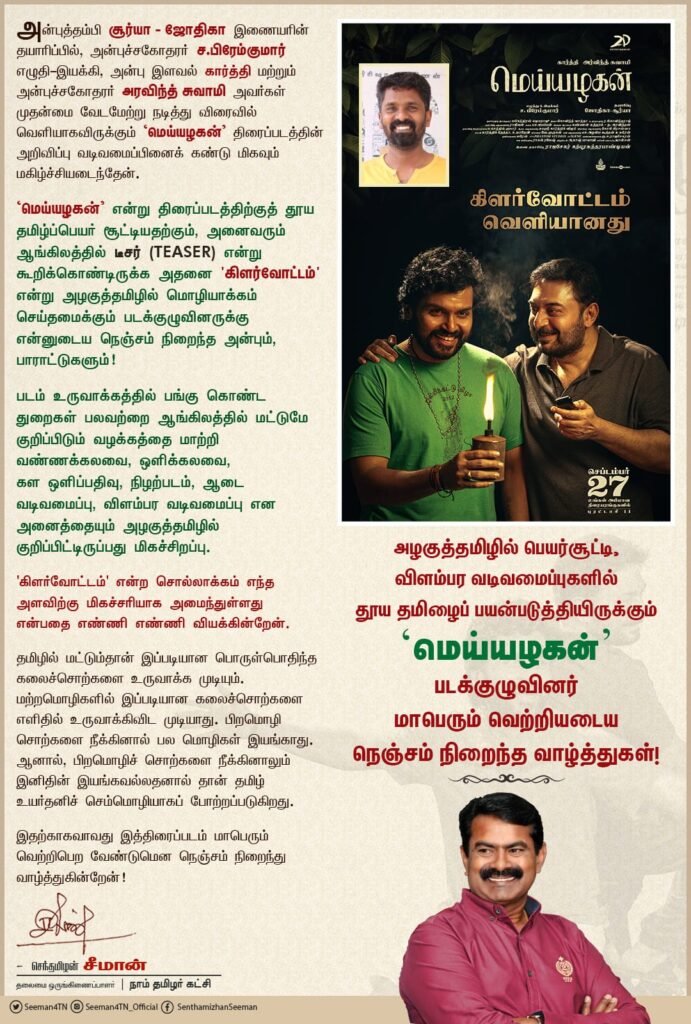 ‘மெய்யழகன்’ என்று திரைப்படத்திற்குத் தூய தமிழ்ப்பெயர் சூட்டியதற்கும், அனைவரும் ஆங்கிலத்தில் டீசர் (TEASER) என்று கூறிக்கொண்டிருக்க அதனை ‘கிளர்வோட்டம்’ என்று அழகுத்தமிழில் மொழியாக்கம் செய்தமைக்கும் படக்குழுவினருக்கு என்னுடைய நெஞ்சம் நிறைந்த அன்பும், பாராட்டுகளும்!