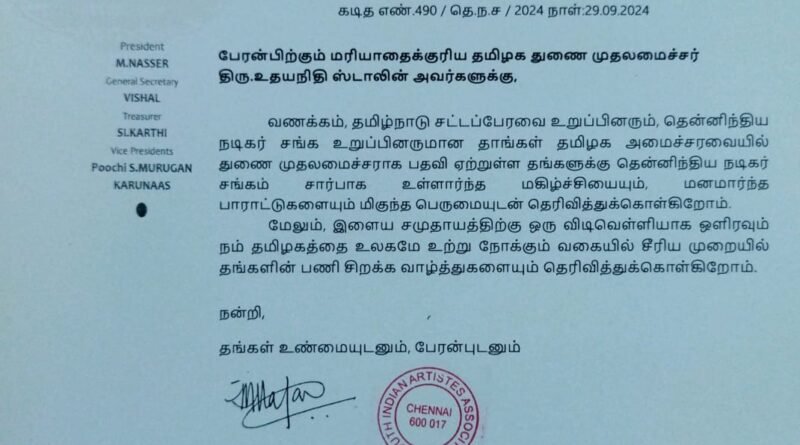 வணக்கம், தமிழ்நாடு சட்டப்பேரவை உறுப்பினரும், தென்னிந்திய நடிகர் சங்க உறுப்பினருமான தாங்கள் தமிழக அமைச்சரவையில் துணை முதலமைச்சராக பதவி ஏற்றுள்ள தங்களுக்கு தென்னிந்திய நடிகர் சங்கம் சார்பாக உள்ளார்ந்த மகிழ்ச்சியையும், மனமார்ந்த பாராட்டுகளையும் மிகுந்த பெருமையுடன் தெரிவித்துக்கொள்கிறோம்.