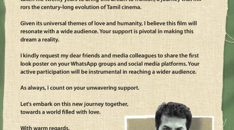 அன்பிற்குரிய நண்பர்கள் மற்றும் மரியாதைக்குரிய பத்திரிகை, ஊடக நண்பர்கள் தங்கள் வாட்ஸப் குழுக்கள் மற்றும் சமூக வலைத்தளங்களிலும் இப்படத்தின் முதல் பார்வையைப் பகிர்ந்து, எல்லோரிடமும் பரவலாக எடுத்துச்செல்வது இந்தக் கனவைச் சாத்தியமாக்குவதில் முக்கியமான பங்களிப்பாக இருக்குமென்று நான் நம்புகிறேன்.