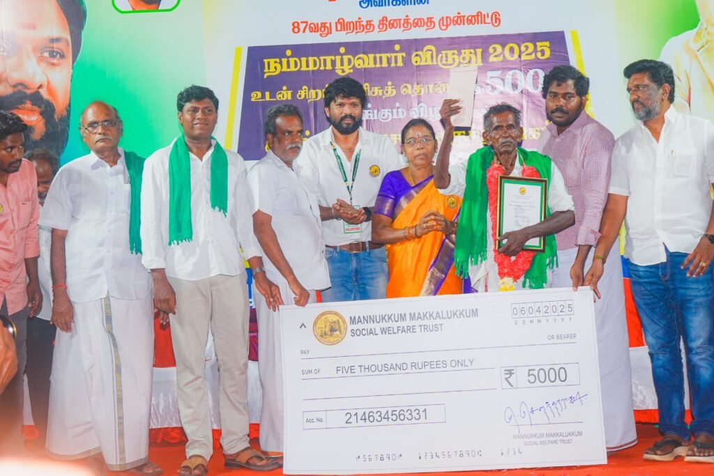 நம்மாழ்வார் பிறந்த நாளை முன்னிட்டு உசிலம்பட்டி பகுதியில் உள்ள 11 விவசாயிகளை முதற்கட்டமாக கண்டுபிடித்து விருதும், ரொக்க பணமும் எனது மண்ணுக்கும் மக்களுக்கும் அறக்கட்டளை மூலம் கொடுத்து எனது நன்றியை தெரிவித்துள்ளேன். அதை நான் பிறந்த பிறப்பிற்கு கிடைத்த மிக பெரிய அர்த்தமாக உணர்கிறேன்.,