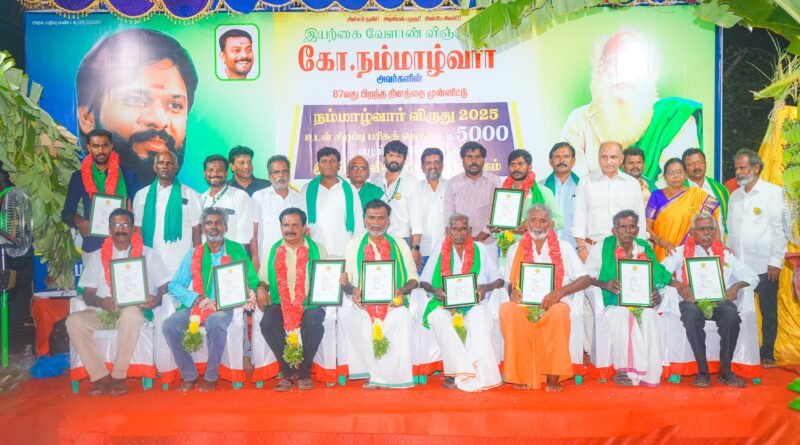 மதுரை மாவட்டம் உசிலம்பட்டி முருகன் கோவில் முன்பு நடிகரும், தவெக தலைவர் விஜய் -யின் ஆதரவாளரான சௌந்தரராஜாவின் மண்ணுக்கும் மக்களுக்கும் அறக்கட்டளை சார்பில் நம்மாழ்வாரின் 87வது பிறந்த நாளை முன்னிட்டு இயற்கை விவசாயிகள் 11 பேருக்கு நம்மாழ்வார் விருதும், 5 ஆயிரம் ரூபாய் ரொக்கமும் வழங்கி ஊக்கபடுத்தினார்.,