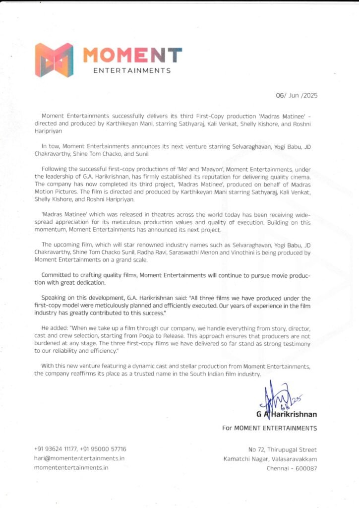 செல்வராகவன், யோகி பாபு, ஜெ டி சக்கரவர்த்தி, ஷைன் டோம் சாக்கோ, சுனில் உள்ளிட்ட திரையுலக பிரபலங்கள் நடிக்கும் இப்படத்தை மொமண்ட் என்டர்டெயின்மெண்ட்ஸ் தயாரித்து வருகிறது. ராதாரவி, சரஸ்வதி மேனன் மற்றும் வினோதினி உள்ளிட்டோரும் முக்கிய வேடங்களில் நடிக்கின்றனர். இறுதிக்கட்ட பணிகள் விறுவிறுப்பாக நடைபெற்று வரும் நிலையில் செப்டம்பர் மாதம் இப்படத்தை வெளியிட திட்டமிடப்பட்டுள்ளது. தரமான திரைப்படங்களை தொடர்ந்து தயாரிக்க மொமண்ட் என்டர்டெயின்மெண்ட்ஸ் உறுதி பூண்டுள்ளது.