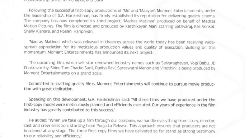 ‘மோ’, ‘மாயோன்’ மூலம் திரைப்படங்களை ஃபர்ஸ்ட் காப்பி முறையில் வெற்றிகரமாக தயாரிப்பதில் முத்திரை பதித்த ஜி. ஏ. ஹரிகிருஷ்ணன் தலைமையிலான மொமண்ட் என்டர்டெயின்மெண்ட்ஸ் நிறுவனம், தனது மூன்றாவது படைப்பாக மெட்ராஸ் மோஷன் பிக்சர்ஸ் நிறுவனத்திற்காக ‘மெட்ராஸ் மேட்னி’ படத்தை தயாரித்துள்ளது. கார்த்திகேயன் மணி தயாரிப்பு மற்றும் இயக்கத்தில் உருவாகியுள்ள இப்படத்தில் சத்யராஜ், காளி வெங்கட், ஷெல்லி கிஷோர், ரோஷினி ஹரிப்ரியன் உள்ளிட்டோர் நடித்துள்ளனர்.