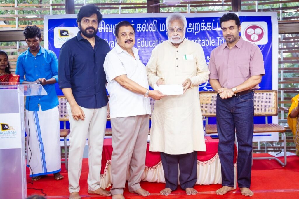 முன்னதாக, திரைக்கலைஞர் கார்த்தி வரவேற்று பேசியதாவது, “1979-ஆம் ஆண்டு, மே மாதம் தொடங்கப்பட்ட ‘சிவகுமார் கல்வி அறக்கட்டளை’தொடர்ந்து, பிளஸ் டூ தேர்வில் சிறந்த உயர்ந்த மதிப்பெண்கள் எடுத்த மாணவர்களை ஊக்கப்படுத்தி வருகிறது. 2005-இல் அகரம் ஃபவுண்டேஷன் தொடங்கப்பட்ட பிறகு ‘சிவகுமார் கல்வி அறக்கட்டளை’ பணிகளை அகரம் பொறுப்பேற்று நடத்தி வருகிறது. சிறந்த மதிப்பெண்கள் பெற்றவர்கள் என்பதை கடந்து, எந்த சூழலில் இருந்து படித்து வருகிறார்கள் என்பதை கண்டறிந்து, அவர்களில் வருடத்திற்கு 25 நபர்களுக்கு பரிசளித்து பாராட்டி வருகிறோம் என்றார்.