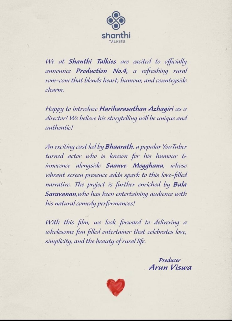 தயாரிப்பாளர் அருண் விஸ்வா தலைமையிலான சாந்தி டாக்கீஸ் தயாரிப்பில் அறிமுக இயக்குநர் ஹரிஹரசுதன் இயக்கத்தில் ஃபைனலி பாரத் மற்றும் ஷான்வி மேக்னா நடிக்கும் புதிய படமான ’புரொடக்ஷன் நம்பர். 4’ திரைப்படத்தின் அறிவிப்பு வெளியாகியுள்ளது. பல வருடங்களாக புதிய திறமையாளர்களையும் நல்ல கதைகளையும் ஊக்குவித்து படங்கள் தயாரித்து வரும் இந்நிறுவனம் தமிழ் சினிமா துறையில் தனக்கென தனியிடம் பிடித்துள்ளது.