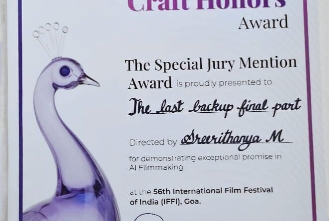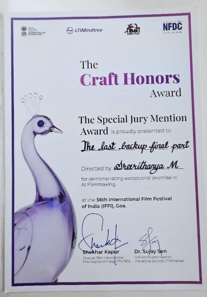 சினிமா பேக்டரி அகாடமியில் படிக்கும் மாணவி ஸ்ரீ ரிதன்யா இயக்கிய ஏஐ குறும்படம் ‘தி லாஸ்ட் பேக்கப்’ கோவா சர்வதேச திரைப்பட விழாவில் உலகளாவிய பிரிவில் தேர்வாகி, மேலும் வரலாற்றுச் சாதனையாக முதல் AI Film Festival Award–ஐ வென்று பெருமை சேர்த்துள்ளது.