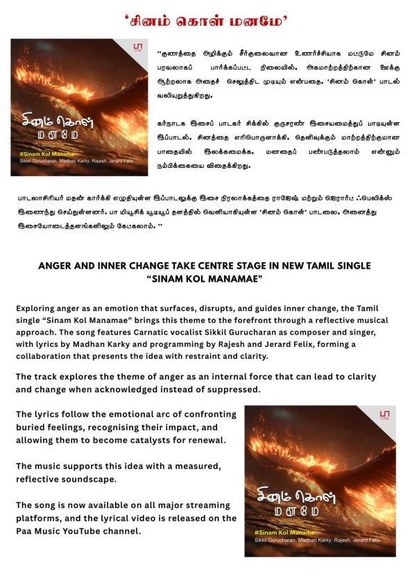 கர்நாடக இசைப் பாடகர் சிக்கில் குருசரண் இசையமைத்துப் பாடியுள்ள இப்பாடல், சினத்தை எரிபொருளாக்கி, தெளிவுக்கும் மாற்றத்திற்குமான பாதையில் இலக்கமைக்க, மனதைப் பண்படுத்தலாம் என்னும் நம்பிக்கையை விதைக்கிறது.